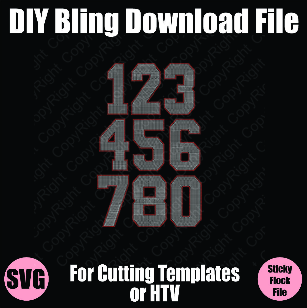 This Download contains files to cut a template with Sticky Flock (or similar material) – PDF and SVG. For Sticky Flock users, you will receive the design sized for sticky flock templates in a PDF and .SVG. These can be imported by most rhinestone programs. The file is set-up for Sticky Flock material with a cutting box around the design for perfect placement in layering multi-color designs. You will need a Cutter with Sticky Flock template material to cut the rhinestone templates.