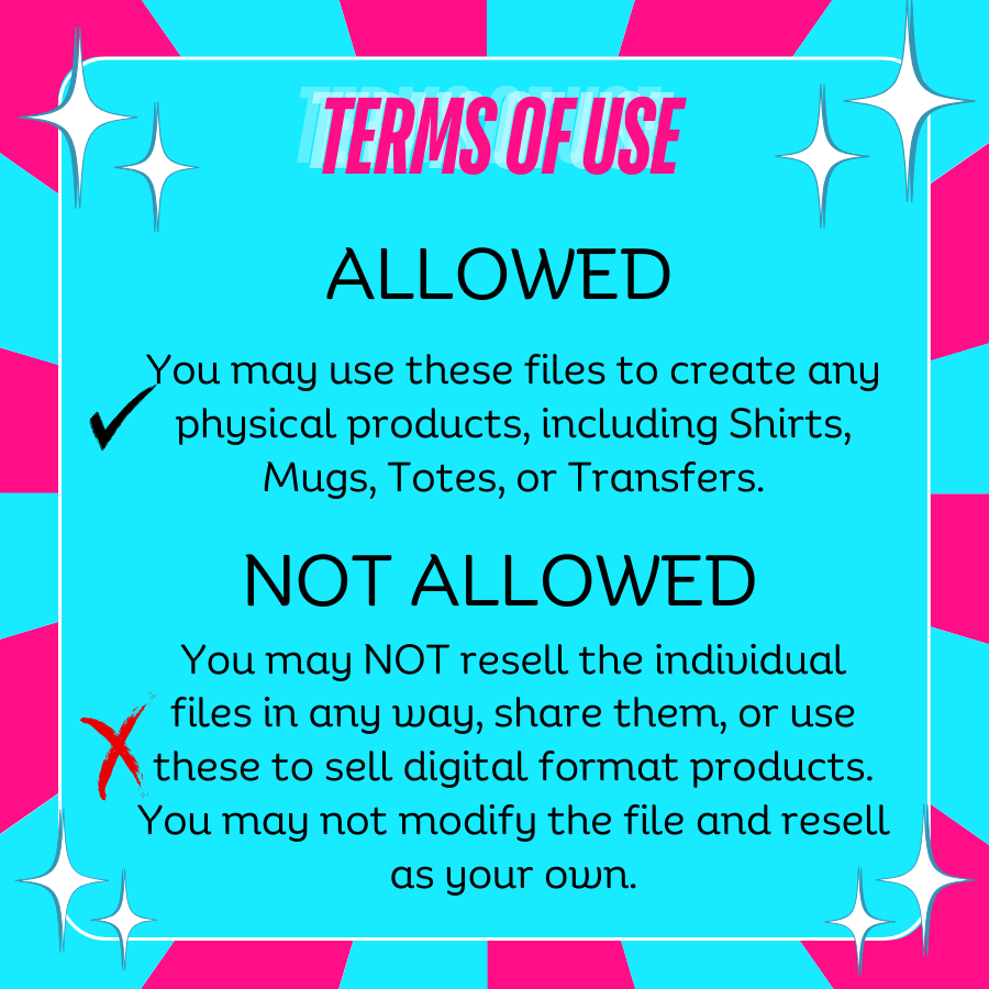 By purchasing/using this file, you are agreeing that you will not share, copy, or sell any part of the design to any business or third party. These digital files are for the sole purpose of creating a finished product of decorated apparel.